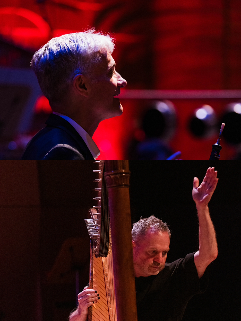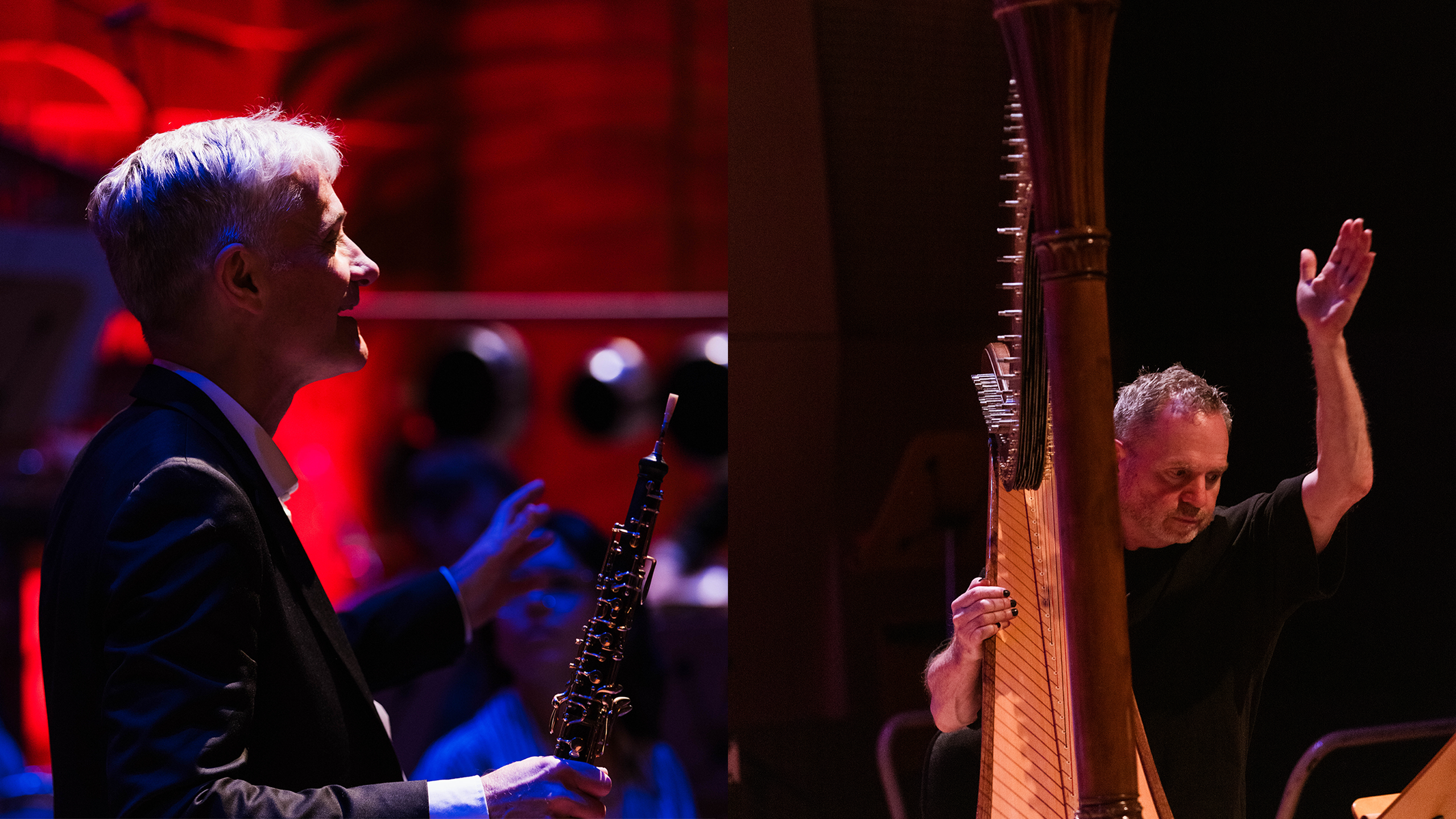For solo oboe and harp, & an ensemble of 28 musicians: flutes, oboe, clarinets, bassoons, horns, trumpets, trombones, euphonium, percussion, piano, keyboard, violins, viola, violoncello, and contrabass