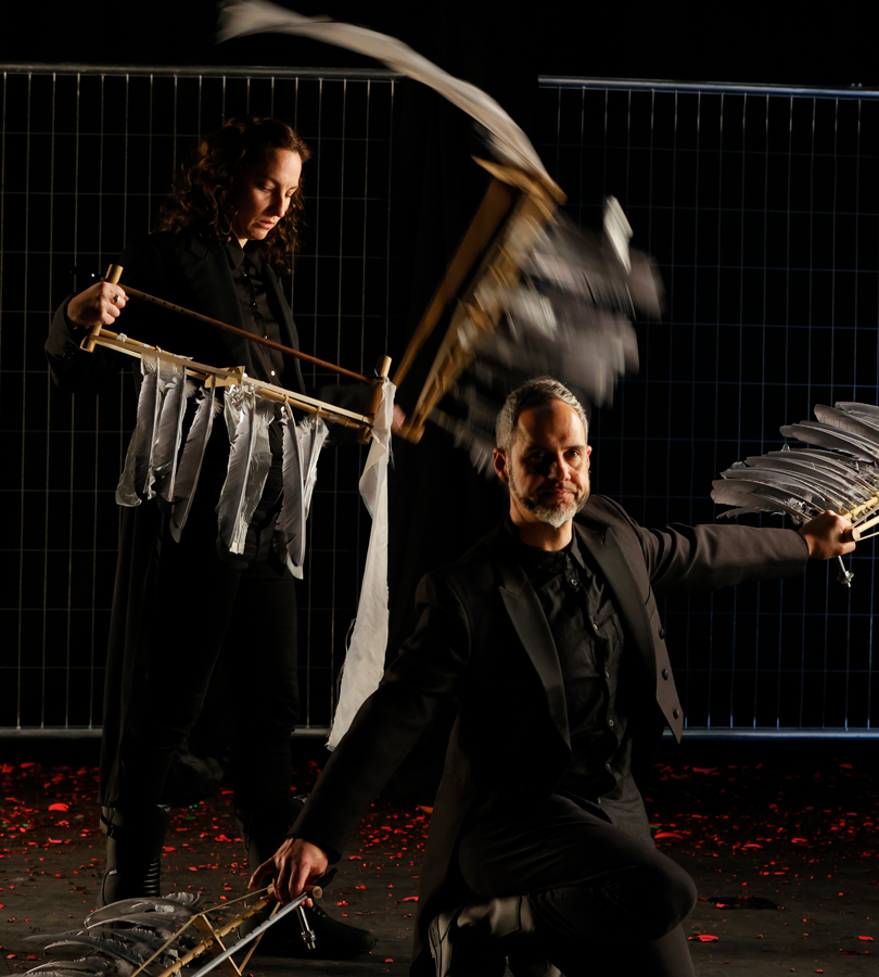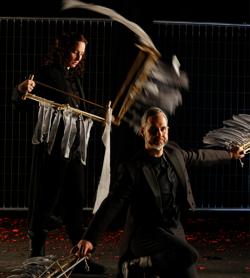 Pigeons is a clay shooting event, but the birds are the musicians and pigeons are the ammo. Three robotic trap machines take centre stage. In unrelenting, symphonic, patterns, they hurl hundreds of fluorescent clay targets at a wall of suspended, resonant percussive objects. The musicians duck, flap, glide and slide among the projectiles, in a frantic search for safety. Glorious music rings out—fragile, violent, poetic and heroic. It’s percussionist vs pigeon. Human vs machine.